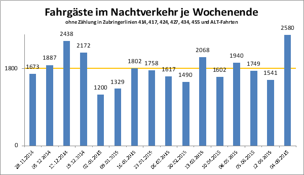 Nach gut neun Monaten Nachlinienverkehr zeigt sich bei den regelmäßig stattfindenden Zählungen ein stabiles Bild. Im Mittel nutzen etwa 1.800 Fahrgäste[1] jedes Wochenende die zusätzlichen Fahrten (Freitag/Samstag 2.00, 3.00, 4.00 und Samstag/Sonntag 3.00 und 4.00).