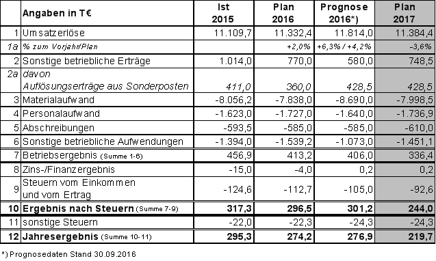 Im Vergleich zu den Daten der Jahre 2015 und 2016 stellen sich die Planzahlen wie folgt dar: