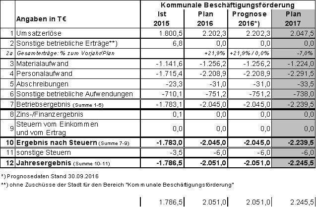 Der Wirtschaftsplan der VHS Arbeit und Beruf GmbH gliedert sich in die Geschäftsbereiche „Kommunale Beschäftigungsförderung“ und „Allgemeine Projekte“. Der Wirtschaftsplan 2017 der VHS Arbeit und Beruf GmbH weist im Erfolgsplan bei Gesamterträgen (inklusive Zinserträgen) in Höhe von 5.326,8 T€ und Gesamtaufwendungen (inklusive Steuern) in Höhe von 5.326,8 T€ ein ausgeglichenes Jahresergebnis aus. Die Erträge beinhalten den Verlustausgleich der Stadt für den Bereich „Kommunale Beschäftigungsförderung“ in Höhe von 2.245,5 T€.