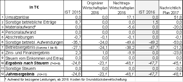 Die Gewinn- und Verlustrechnung 2016 der Gesellschaft weist (vor Verlustübernahme durch die Stadt) einen Fehlbetrag von 47,7 T€ aus und liegt damit um rd. 0,4 T€ besser als im Nachtragswirtschaftsplan 2016 seinerzeit veranschlagt.