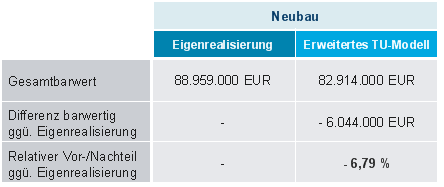 Der Barwert des TU-Modells liegt etwa 6 Mio. EUR unterhalb der Obergrenze der Eigenrealisierung. Prozentual liegt der Wirtschaftlichkeitsvorteil dieser Variante bei etwa 6,8 %.