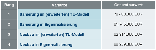 Die beiden untersuchten Sanierungsvarianten (Eigenrealisierung und erweitertes TU-Modell) stellen sich gegenüber den beiden Neubauvarianten als vorteilig dar. Barwertig liegt der Vorteil bei ca. 1,17 Mio. EUR bis 10,49 Mio. EUR.