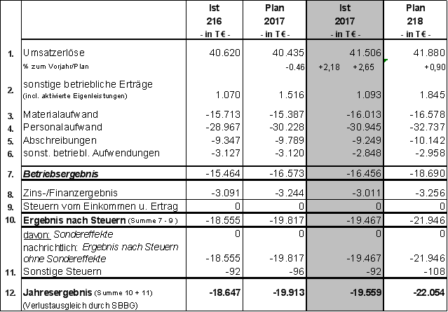 Folgende Tabelle zeigt die Ergebnisentwicklung der Jahre 2016 und 2017 sowie die Planzahlen 2018.