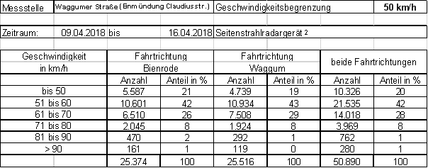Das Seitenstrahlradarmessgerät wurde in der Zeit vom 09.04.2018 bis 16.04.2018 für beide Fahrtrichtungen mit folgendem Ergebnis installiert: