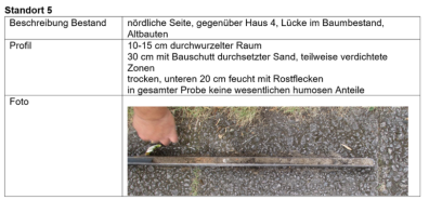 An Standort 4 (Schurf gegenüber Hausnummer 23) betrug die Grabungstiefe 1,30 m. Der oberste, humose Horizont ist kräftig durchwurzelt, darunter liegen ca. 20 cm Bauschutt. Dieser bestand aus zerkleinerten Ziegelsteinen, Betonresten u.ä.. Unter dieser Schicht werden kaum noch Wurzeln angetroffen. Vorhandene Wurzeln streichen horizontal auf einer Ebene und zeigen damit, dass nicht gelungen ist, in die darunterliegenden Horizonte einzuwurzeln. Der Baggerführer berichtete über den großen Kraftaufwand seiner Maschine, um das Material in den unteren Schichten zu lösen. Ab ca. 1 m Tiefe ist der Boden grau verfärbt, ein Hinweis auf hohen Tonanteil. Wurzeln sind in diese Tiefe nicht vorgedrungen.