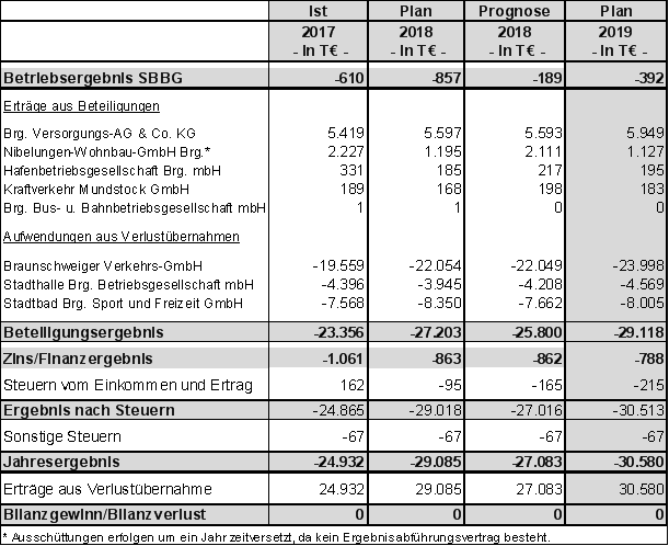 Der Wirtschaftsplan 2019 der SBBG weist einen Zuschussbedarf in Höhe von insgesamt 30.580 T€ aus, der sich aus dem Betriebsergebnis inklusive sonstigen Steuern (-459 T€), dem Zinsergebnis (-788 T€), den Steuern vom Einkommen und Ertrag (-215 T€) sowie dem Beteiligungsergebnis der Tochter- bzw. Beteiligungsgesellschaften (-29.118 T€) zusammensetzt.
