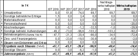 Der Erfolgsplan 2019 weist einen Fehlbetrag von 75,5 T€ aus, der von der Stadt im Rahmen der Behandlung des Jahresabschlusses 2019 im Jahr 2020 ausgeglichen werden soll. Mittel in entsprechender Höhe sind im Haushalt der Stadt eingeplant.