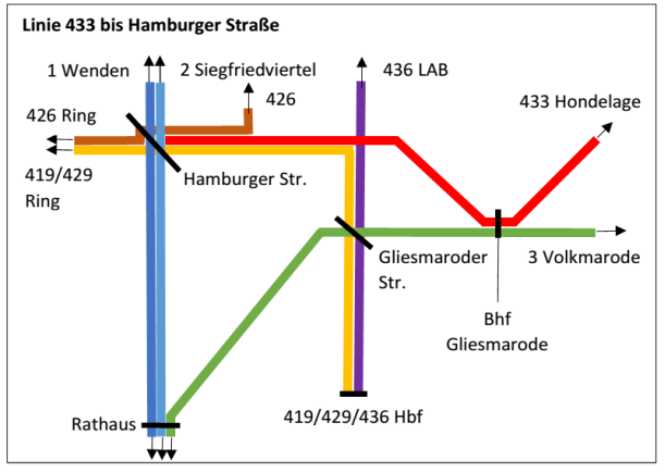 Damit auch vom Nordring eine attraktive Anbindung zum Bahnhof Gliesmarode besteht, soll die Buslinie 433 mit allen Fahrten immer mindestens bis zur Hamburger Straße verkehren. Denn dann erreichen Fahrgäste aus Hondelage, Querum und vom Bahnhof Gliesmarode mit nur einem Umsteigevorgang viele Ziele im Stadtgebiet (z. B. Naturhistorisches Museum, Wasserwelt, Stadion, Westbahnhof, Weißes Ross, Hauptbahnhof, etc.)
