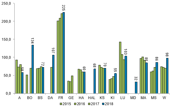 [7] Quelle: Inanspruchnahme von Leistungen der Hilfen zur Erziehung insgesamt (interk. Vergleich der mittleren Großstädte; 2018; Angaben der andauernden und beendeten Hilfen bezogen auf 10.000 der unter 21-Jährigen) (Referenz: Anzahl der Hilfen)