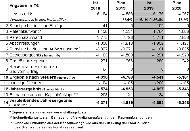 Bei Gesamterträgen in Höhe von 6.278 T€ (inkl. Zinserträgen) und Gesamtaufwendungen in Höhe von 11.105 T€ (inkl. Zinsaufwendungen und Steuern) erwirtschaftet die Gesellschaft im Geschäftsjahr 2019 einen Fehlbetrag in Höhe von 4.827 T€. Hiervon werden 134 T€ durch die Entnahme aus der Kapitalrücklage für Abschreibungen im Rahmen des Projektes 2009 ausgeglichen. Es verbleibt ein Fehlbetrag in Höhe von 4.693 T€. Gegenüber der Wirtschaftsplanung (-4.819 T€) ergibt sich damit eine Ergebnisverbesserung in Höhe von 127 T€.