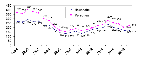 2019 wurden im Vergleich zu den Jahren 2017 und 2018 etwas mehr Personen in den städtischen Wohnungslosenunterkünften aufgenommen. Die Anzahl der Aufnahmen bewegt sich allerdings weiterhin im vergleichsweise niedrigem Bereich. In diesem Zuge ist die erfolgreiche Arbeit der Zentralen Stelle für Wohnraumhilfe sowie die Prävention der Wohnhilfen zu nennen.