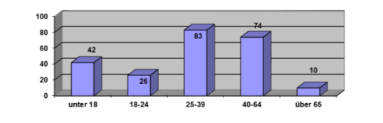 Im letzten Jahr wurden 168 männliche und 67 weibliche Personen in städtische Wohnungslosenunterkünfte eingewiesen. Die nachstehende Tabelle zeigt die Altersstruktur der insgesamt 235 Personen: