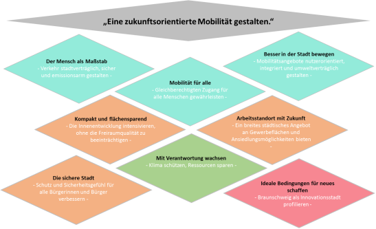 Das Fundament für die Zielformulierung bilden das im Rahmen des ISEK erarbeitete „Zukunftsbild für Braunschweig“ und das Leitziel für den Bereich Mobilität „Eine zukunftsorientierte Mobilität gestalten“.