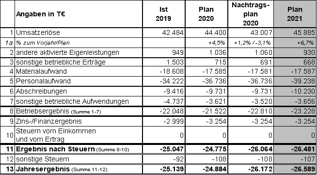 Der Wirtschaftsplan 2021 der BSVG weist einen Fehlbetrag in Höhe von 26.589 T€ aus. Der Verlust wird aufgrund des bestehenden Beherrschungs- und Gewinnabführungsvertrages von der SBBG ausgeglichen. In der Planung wurde eine Beendigung der Corona-Pandemie in 2021 unterstellt.