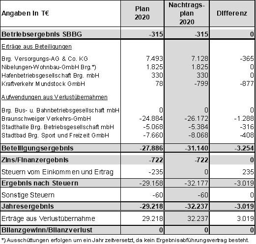 Der Wirtschaftsplan 2021 der SBBG weist einen Fehlbetrag in Höhe von insgesamt 34.407 T€ aus, der sich aus dem Betriebsergebnis inklusive sonstigen Steuern (-459 T€), dem Zinsergebnis (-814 T€), den Steuern vom Einkommen und Ertrag (-229 T€) sowie dem Beteiligungsergebnis der Tochter- bzw. Beteiligungsgesellschaften (-32.905 T€) zusammensetzt. Eine Übernahme des Verlustes durch die Stadt Braunschweig ist vorgesehen.