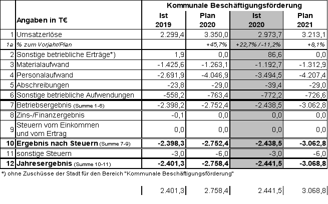 Das Ergebnis für den Bereich „Kommunale Beschäftigungsförderung“ fällt um 316,8 T€ besser aus als geplant. Der geplante Verlustausgleich wird entsprechend in dieser Höhe nicht benötigt.