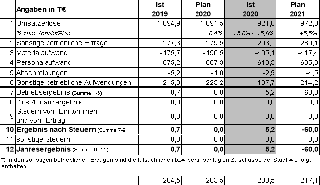 Die Umsatzerlöse fallen gegenüber der Planung um 196,6 T€ höher aus, was im Wesentlichen auf Kompensationszahlungen nach dem Sozialdienstleister-Einsatzgesetz(SodEG) (359,1 T€) zurückzuführen ist. Die Teilnehmergebühren fallen coronabedingt um 295,1 T€ geringer aus als geplant.