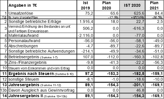 Der Jahresfehlbetrag für das Geschäftsjahr 2020 liegt bei 201.087,33 € (Plan 2020: 154.300,00 €). Bilanztechnisch verbleibt nach Verrechnung mit dem Gewinnvortrag aus dem Vorjahr in Höhe von 99.003,07 € ein Bilanzverlust von 102.084,26 €.