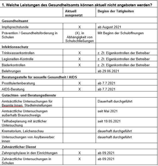 Aus Sicht des Gesundheitsamtes ist es wichtig Angebote aufrechtzuerhalten, die die Gesundheit der Bürger*innen und vulnerablen Gruppen schützen. Dazu gehören u.a. die Aufrechterhaltung der Pflichtaufgaben im Sozialpsychiatrischen Dienst wie Krisenintervention, Unterbringung nach NPsychKG unter veränderten Hygienevorgaben und Sicherheitsregeln, Beratung, Betreuung, Listen mit Notfallnummern, Erreichbarkeit von Beratungseinrichtungen und dem Unterstützungssystem, Wöchentliche Telefonkonferenz mit Anbietern aus dem Bereich der Eingliederungshilfe und psychiatrischen Pflege sowie der Psychosoziale Krisendienst am Wochenende. Weiterhin wurden während der gesamten Pandemie Kinder im Rahmen der Eingliederungshilfe betreut. Seit dem 10.05.21 finden Schuleingangsguntersuchungen statt und wurden nachgeholt, um den Gesundheitszustand von Kindern zu kennen, präventiv einzuwirken und geeignete Maßnahmen zu empfehlen. Zum Schutze der älteren Bevölkerung wurden kontinuierlich Test- und Angebote unterbreitet, Flächenscreenings initiiert, um Infektionen frühzeitig zu erkennen. Das Containment des Gesundheitsamts arbeitet in Spezialteams, um bestenfalls taggleich die Infektionsketten zu unterbrechen und eine zügige Kontaktpersonennachverfolgung zu gewährleisten zum Schutz der Bürgerschaft Braunschweigs. Ziel ist das Gesundheitsamt mit sinkender Inzidenz und mit dem Fortschritt der Impfquote in eine neue Struktur zu bringen, die die Pandemie und die Erfüllung der Pflichtaufgaben im öffentlichen Gesundheitsdienst vereinbaren lässt.
