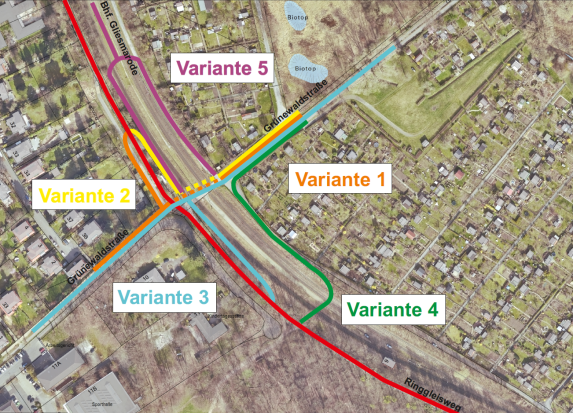 - In der Variantenuntersuchung für eine Geh- und Radwegüber- oder -unterführung als Ersatz für den BÜ Grünewaldstraße werden die fünf in Abb. 1 dargestellten Varianten untersucht.