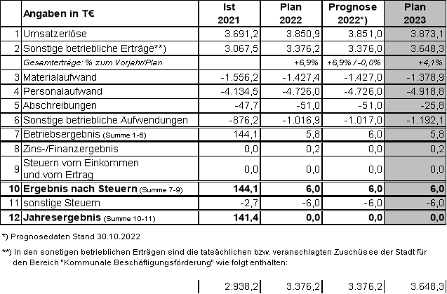 Der Wirtschaftsplan 2023 der VHS Arbeit und Beruf GmbH weist im Erfolgsplan bei Gesamterträgen (inklusive Zinserträgen) in Höhe von 7.521,4 T€ und Gesamtaufwendungen (inklusive Steuern) in Höhe von 7.521,4 T€ ein ausgeglichenes Jahresergebnis aus. Die Erträge beinhalten den Zuschuss der Stadt für den Bereich „Kommunale Beschäftigungsförderung“ in Höhe von 3.648,3 T€.