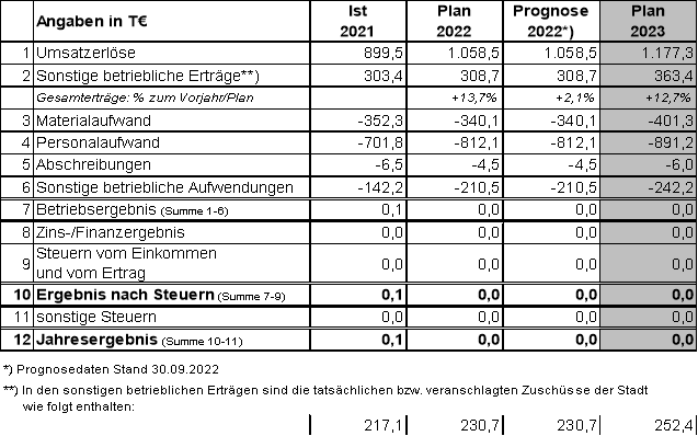Der Wirtschaftsplan 2023 der Haus der Familie GmbH weist im Erfolgsplan bei Gesamterträgen in Höhe von 1.540,7 T€ und Gesamtaufwendungen in Höhe von 1.540,7 T€ ein ausgeglichenes Jahresergebnis aus. Die Erträge beinhalten einen Zuschuss der Stadt in Höhe von 252,4 T€.