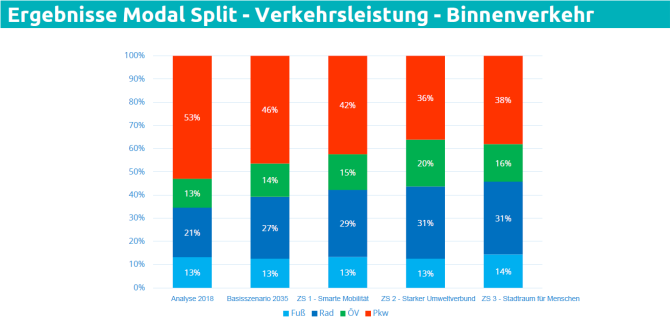 - Im Binnenverkehr (Start und Ziel im Stadtgebiet) erreichen alle drei Zukunftsszenarien hohe Wegeanteile im Umweltverbund, der MIV-Anteil sinkt auf Anteile von 23-26% ab.