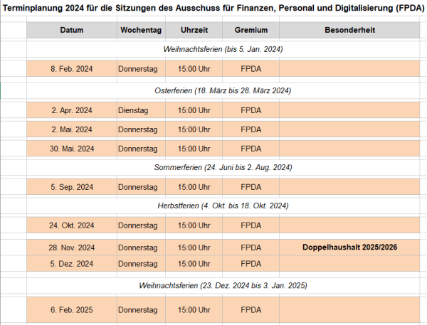 Sitzungstermine für den Ausschuss für Finanzen, Personal und Digitalisierung (FPDA) im Jahr 2024