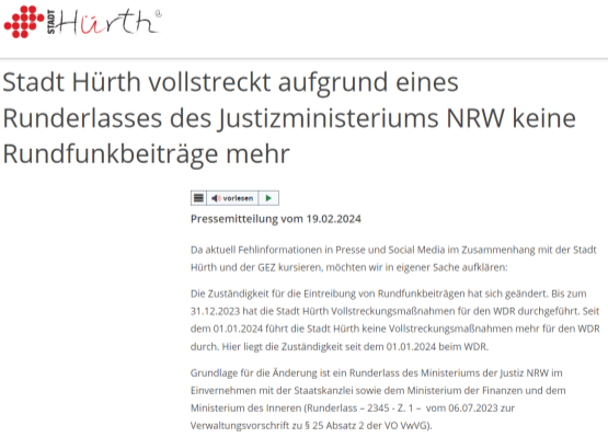 Die insbesondere in den sozialen Medien grassierenden Gerüchte, dass die Stadt Hürth „beschlossen habe, die Rundfunkbeiträge nicht mehr zu vollstrecken“, sind so nicht korrekt. Vielmehr hat der Westdeutsche Rundfunk (WDR) inzwischen selbst die Aufgaben einer Vollstreckungsbehörde übernommen und deshalb die Vollstreckung durch die Kommunen in Nordrhein-Westfalen sukzessive zurückgeführt. Ein Auszug aus einem Artikel auf der Homepage der Stadt Hürth dazu:
