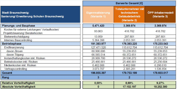 Die vWU weist im Ergebnis einen Barwert der einzelnen Beschaffungsvarianten aus. Der Barwert spiegelt den heutigen Zeitwert aller zukünftigen Kosten für Planung, Bau, Betrieb der vier Schulstandorte für den kompletten Betrachtungszeitraum wider. Diese Summe wäre demnach heute zu finanzieren, um alle zukünftigen Forderungen des Vorhabens zu jedem Zeitpunkt der Vertragslaufzeit begleichen zu können. Insofern beinhaltet der Barwert neben den Investitionen und deren Finanzierung (Zinsen und Tilgung des Kommunalkredits) auch alle für die Umsetzung notwendigen Transaktions- und Verwaltungskosten (z. B. Personalaufwand) auf Seiten der Stadt Braunschweig.