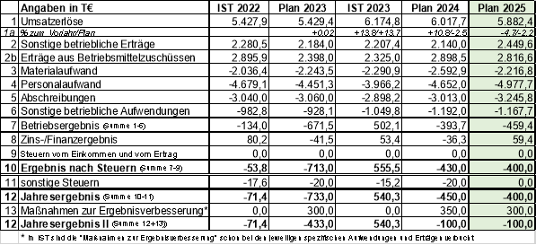 Der Plan 2025 weist Gesamterträge (ohne Betriebsmittelzuschüsse) in Höhe von rd. 8.445,8 T€ und Gesamtaufwendungen in Höhe von ca. 11.662,3 T€ aus. Ferner sind ‚Maßnahmen zur Ergebnisverbesserung‘ in Höhe von 300,0 T€ eingeplant. Die Geschäftsführung hofft wie in den Vorjahren durch diverse Anstrengungen bei unterschiedlichen Ertrags- und Aufwandspositionen in genannter Höhe positive Ergebnisauswirkungen erzielen zu können. Es verbleibt ein Zuschussbedarf der Gesellschafterinnen Stadt Braunschweig (2.034,7 T€) und Stadt Wolfsburg (782,0 T€) in Gesamthöhe von 2.816,6 T€ sowie ein planerisches Defizit von 100,0 T€.