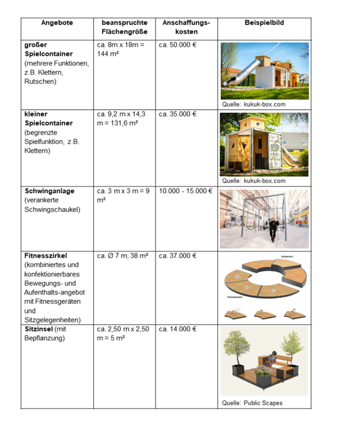 Es werden in dem Zusammenhang drei Arten von Spiel- und Bewegungsangeboten unterschieden: Spielcontainer mit mehreren Funktionen, Spielcontainer mit begrenzter Spielfunktion, Schwinganlage und Fitnesszirkel. Zur Stärkung der Aufenthaltsfunktion sollen außerdem Möglichkeiten zum Verweilen in Form von Sitzinseln mit ergänzendem Grün geschaffen werden. Bei diesem Angebot wäre es wünschenswert, wenn für die temporäre Pflege (z.B. Gießen bei Trockenheit) die Anlieger (Anwohnende und/oder Gewerbetreibende) der jeweiligen Standorte des mobilen Grüns gewonnen werden könnten.