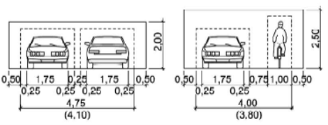 Abbildung 1: Erforderlicher Raumbedarf für den Begegnungsfall Pkw-Pkw (links) und Pkw-Rad (rechts) gemäß den Richtlinien für die Anlage von Stadtstraße, Ausgabe 2006 (RASt 06), (Klammermaße: mit eingeschränkten Bewegungsspielraum)