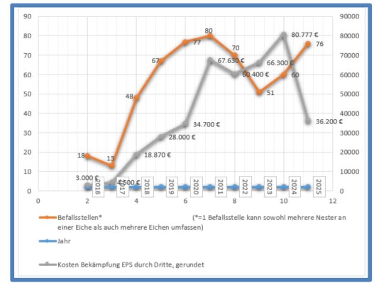 Abb. 1: Schwankungen und Kosten und Befallsstellen zwischen 2016 und 2025