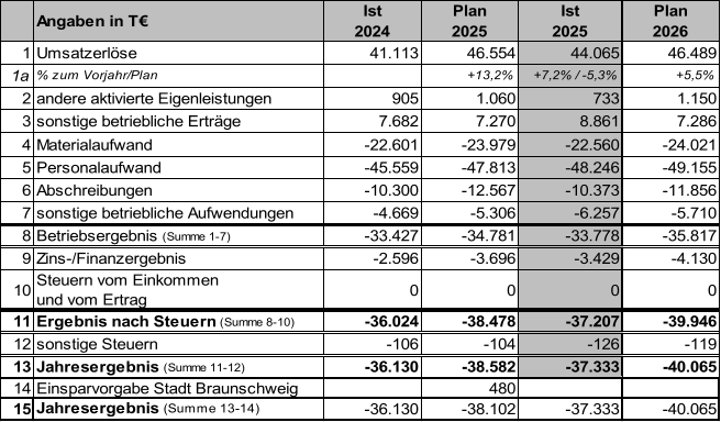 Die Gewinn- und Verlustrechnung 2025 der BSVG weist bei Gesamterträgen (inkl. Zinserträgen) in Höhe von 54.969 T€ und Gesamtaufwendungen (inkl. Zinsaufwendungen und Steuern) in Höhe von 92.302 T€ einen Jahresfehlbetrag in Höhe von 37.333 T€ aus. Der Verlust wird aufgrund des bestehenden Beherrschungs- und Gewinnabführungsvertrages von der Braunschweig Beteiligungen GmbH (BSBG) ausgeglichen.