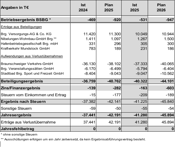 Die BSBG schließt das Geschäftsjahr 2025 mit einem Verlust in Höhe von 41.280 T€ ab, der von der Gesellschafterin Stadt Braunschweig ausgeglichen wurde. Gegenüber der Wirtschaftsplanung für das Jahr 2025 ergibt sich ein um 911 T€ geringerer Verlustausgleichsbedarf.