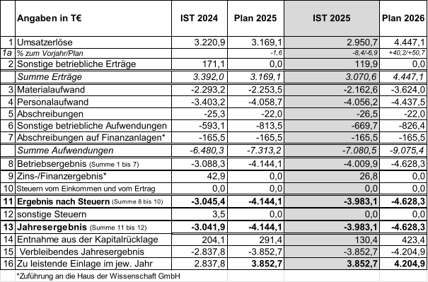 Der Jahresfehlbetrag liegt damit in etwa auf dem im Wirtschaftsplan 2025 prognostizierten Wert von 225 T€.