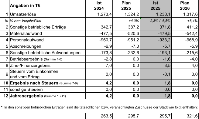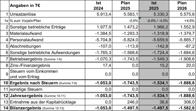 1.743,5 T€ wurde entsprechend um 209,4 T€ unterschritten. Die Stadt Braunschweig übernimmt gemäß der Finanzplanung aus der Wirtschaftsplanung 2025 einen Verlustausgleich in Höhe von 1.497,5 T€. Im Rahmen der Wirtschaftsplanung 2025 wurde die Zuführung eines Betrages in Höhe von 246 T€ in die Kapitalrücklage aus dem Überschuss/der Ergebnisverbesserung gegenüber dem geplanten Verlustausgleich beschlossen. Im Jahresabschluss 2024 wurde dieser Betrag entsprechend ausgewiesen. In Folge der Ergebnisverbesserung wird nunmehr ein Betrag von 36,6 T€ entnommen, sodass noch ein Betrag in Höhe von 209,4 T€ in der Kapitalrücklage verbleibt.