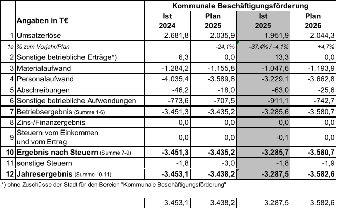 Das Ergebnis für den Bereich „Kommunale Beschäftigungsförderung“ fällt um 151 T€ besser aus als geplant. Der geplante Verlustausgleich wird entsprechend in dieser Höhe nicht benötigt.