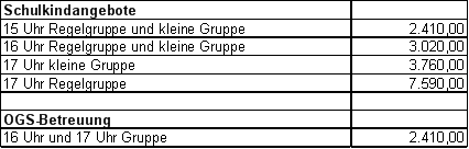Für die aktuell geförderten 305 Gruppen im Kindertagesstättenbereich und 106 Gruppen im Bereich der Schulkindbetreuung ergibt sich ein zusätzlicher Förderbedarf von 1.170.000 € jährlich (429.000 € anteilig für 2015).