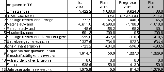Für das Wirtschaftsjahr 2016 werden Umsatzerlöse in Höhe von 1.100 T€ erwartet. Die Umsatzerlöse ergeben sich aus dem Verkauf von gewerblich nutzbaren Bauflächen und aus sonstigen Verkäufen. Umsatzerlöse aus dem Verkauf von Wohnbaugrundstücken sind in 2016 nicht zu erwarten. Die Vermarktung der Wohnbaugrundstücke in den Baugebieten „Im großen Raffkampe/Lamme“, „Am Pfarrgarten/Bevenrode“ und „Meerberg/Leiferde“ wird voraussichtlich in 2015 abgeschlossen und der Bebauungsplan für das neue Wohnbaugebiet „Stöckheim-Süd“ soll erst im Geschäftsjahr 2016 rechtskräftig werden. Umsatzerlöse aus der Vermarktung der in diesem Bereich entstehenden Bauflächen werden voraussichtlich erst ab dem Geschäftsjahr 2017 ertragswirksam.
