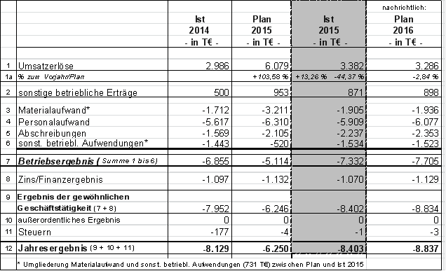 Folgende Tabelle zeigt die Ergebnisentwicklung der Jahre 2014 und 2015 sowie die Planzahlen 2016: