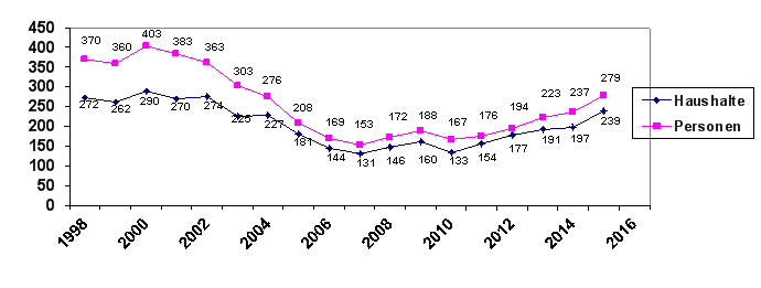 Im Jahr 2015 wurden 293 Personen in den Wohnungsloseneinrichtungen der Stadt Braunschweig aufgenommen, 251 Personen (Vorjahr 232) haben die Unterkünfte im selben Zeitraum verlassen und wurden u.a. mit Wohnraum versorgt.