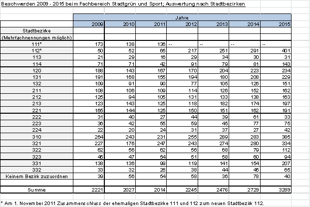 Eine systematische Erfassung der Beschwerden nach Stadtteilen erfolgt nicht. Allerdings werden seit dem Jahr 2009 die Beschwerden den einzelnen Stadtbezirken zugeordnet.