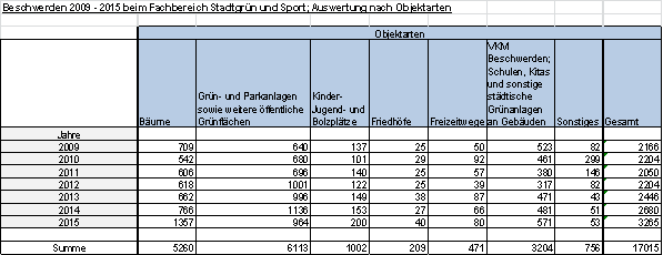 Insgesamt wurden im Zeitraum von 2009 bis 2015 5260 Beschwerden über Baumschäden und mangelnde Baumpflege/Baumscheibenpflege bzw. der Wunsch nach Rückschnitt und Fällung registriert.