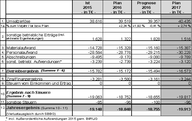 Die gegenüber dem Planwert 2016 im Wirtschaftsjahr 2017 vorgesehenen Ergebnisverbesserungen im Bereich der Umsatzerlöse, der sonstigen betrieblichen Erträge sowie im Zinsergebnis von insgesamt 1.447 T€ reichen insgesamt nicht aus, um die genannten Mehraufwendungen zu decken, sodass sich eine Verlustausweitung gegenüber dem Vorjahr von insgesamt 1.065 T€ ergibt.