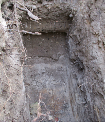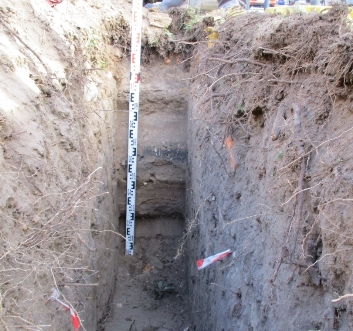 An Standort 1 (Schurf gegenüber Hausnummer 76) betrug die Grabungstiefe 1,50 m. Der oberste Horizont ist intensiv durchwurzelt, darunter liegen ca. 20 cm Bauschutt. Auch hier finden sich darunter verdichtete Horizonte ohne Wurzeln sowie Störungen durch Materialeintrag (schwarze Einschlüsse am Kopf der Grube).
