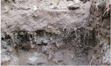 Der oberste Horizont ist durchwurzelt, darunter befinden sich Horizonte ohne Wurzeln.