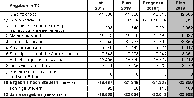 Der Erfolgsplan 2019 und auch die mittelfristige Unternehmensvorschau sind signifikant durch die Ausweitung der Betriebsleistung und die verstärkte Investitionstätigkeit der Gesellschaft geprägt. Hier wirken insbesondere erhöhte Personalaufwendungen als Folge des steigenden Personalbedarfs aus Mehrleistungen sowie die damit verbundenen Energiemengen- und Preismehrungen. Die Ausweitung der Betriebsleistung ist Folge geplanter Qualitätssteigerungen im städtischen ÖPNV sowie der Umsetzung des Ohnefalls zum Stadtbahnausbauprojekt. Ab dem Jahr 2020 wurde zudem das Risiko aus einem veränderten Einnahme-Aufteilungsverfahren im Verkehrsverbund mit einer Annahme berücksichtigt.
