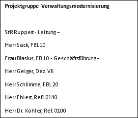 Weiterhin sind in beiden Projektgruppen als ständige Mitglieder Vertreterinnen bzw. Vertreter aus den Dezernaten III, IV und V vorgesehen, um Interessen und Ideen der Fachdezernate einbringen und berücksichtigen zu können.
